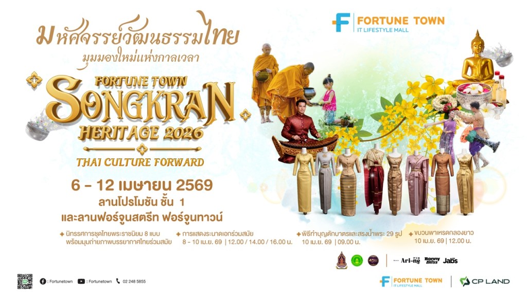 27 มีนาคม 2569, กรุงเทพฯ – ฟอร์จูนทาวน์ (Fortune Town) ศูนย์รวมไอทีและไลฟ์สไตล์ชั้นนำย่าน รัชดา-พระราม 9 ร่วมกับ กลุ่มนิทรรศการ สถาบันวัฒนธรรมศึกษา กรมส่งเสริมวัฒนธรรม กระทรวงวัฒนธรรม ชวนสัมผัสเสน่ห์แห่งวัฒนธรรมไทยในมุมมองใหม่กับงาน “Fortune Town Songkran Heritage 2026: Thai Culture Forward” ร่วมสืบสานประเพณีอันดีงาม พร้อมสร้างบรรยากาศแห่งความเป็นสิริมงคลต้อนรับเทศกาลสงกรานต์ ระหว่างวันที่ 6-12 เมษายน 2569 ณ บริเวณลานโปรโมชัน ชั้น 1 และลานฟอร์จูนสตรีท ฟอร์จูนทาวน์