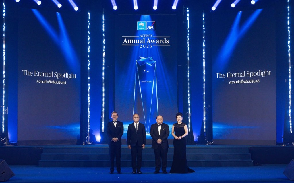 บมจ.กรุงไทย-แอกซ่า ประกันชีวิต จัดงานมอบรางวัลเกียรติยศนักขายประจำปี KTAXA Agency Annual Awards 2025 โดยได้รับเกียรติจาก คุณชูฉัตร ประมูลผล เลขาธิการ สำนักงานคณะกรรมการกำกับและส่งเสริมการประกอบธุรกิจประกันภัย (คนที่ 2 จากซ้าย) คุณสมชัย บุญนำศิริ ประธานกรรมการ บมจ.กรุงไทย-แอกซ่าประกันชีวิต (คนที่ 2 จากขวา) คุณชัยณรงค์ เอื้อสิทธิชัย ประธานเจ้าหน้าที่บริหาร ฝ่ายจัดจำหน่าย (คนซ้าย) และคุณมนต์นิดา มุสิกบุตร ประธานเจ้าหน้าที่บริหาร ฝ่ายตัวแทน (คนที่ 4 จากซ้าย) ร่วมเป็นประธานในพิธีเปิด พร้อมด้วยคณะผู้บริหารระดับสูง ร่วมมอบรางวัลแก่ตัวแทนที่สร้างผลงานยอดเยี่ยมตลอดปี 2568 ที่ผ่านมา