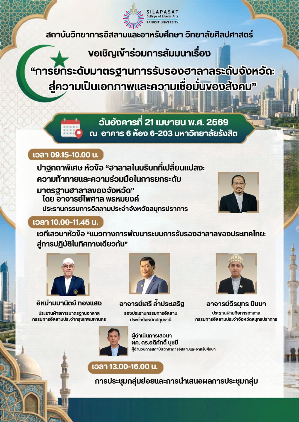 สถาบันวิทยาการอิสลามและอาหรับศึกษา วิทยาลัยศิลปศาสตร์ ร่วมด้วย คณะเทคโนโลยีอาหาร มหาวิทยาลัยรังสิต คณะกรรมการอิสลามประจำกรุงเทพมหานคร จังหวัดปทุมธานี และ จังหวัดสมุทรปราการจัดโครงการสัมมนาเรื่อง “การยกระดับมาตรฐานการรับรองฮาลาลระดับจังหวัด : สู่ความเป็นเอกภาพและความเชื่อมั่นของสังคม” ในวันอังคารที่ 21 เมษายน พ.ศ. 2569 เวลา 08.30 – 16.00 น. ณ ห้อง 6-203 อาคาร Student Center (อาคาร 6) มหาวิทยาลัยรังสิต การสัมมนาครั้งนี้มีวัตถุประสงค์เพื่อแลกเปลี่ยนความรู้และประสบการณ์ในการดำเนินงานด้านการรับรองฮาลาล ตลอดจนสร้างความเข้าใจร่วมกันเกี่ยวกับแนวทางและมาตรฐานในการตรวจรับรองฮาลาลในระดับจังหวัด เพื่อให้เกิดความสอดคล้องในการปฏิบัติงาน และสามารถเป็นต้นแบบในการพัฒนาระบบฮาลาลในระดับจังหวัดอื่น ๆ ต่อไป