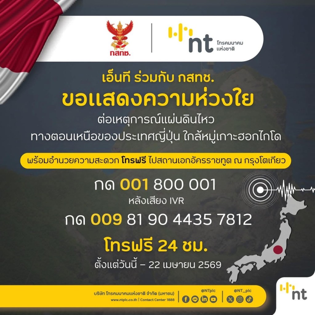 NT ขอแสดงความห่วงใยต่อเหตุการณ์แผ่นดินไหว